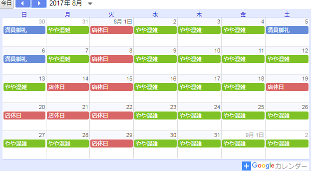 8月の営業日カレンダー
