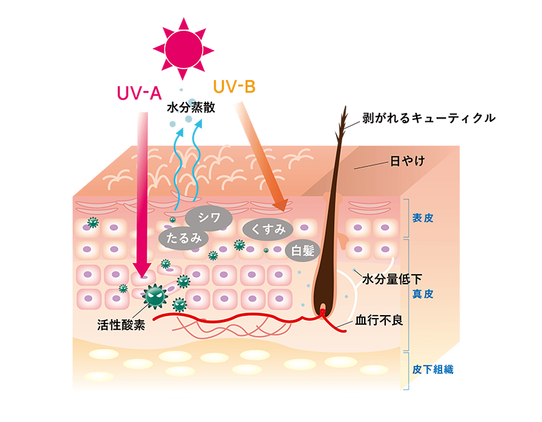 - 紫外線を受けて火傷状態になるとキューティクルが損傷し手触りの低下や切れ毛・枝毛となる